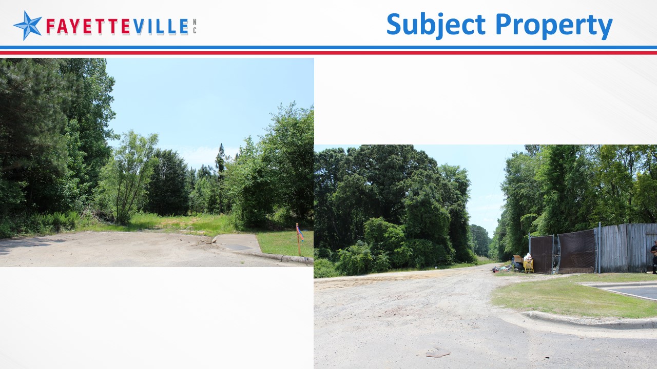This property is located at the end of Jim Johnson Road and Bureau Drive. This property is currently in Fayetteville’s Municipal Influence Area (MIA) and the owner has petitioned for annexation. This is a contiguous rezoning of property that runs along Interstate 95. Both commercial and rural zoning and uses surround this property.