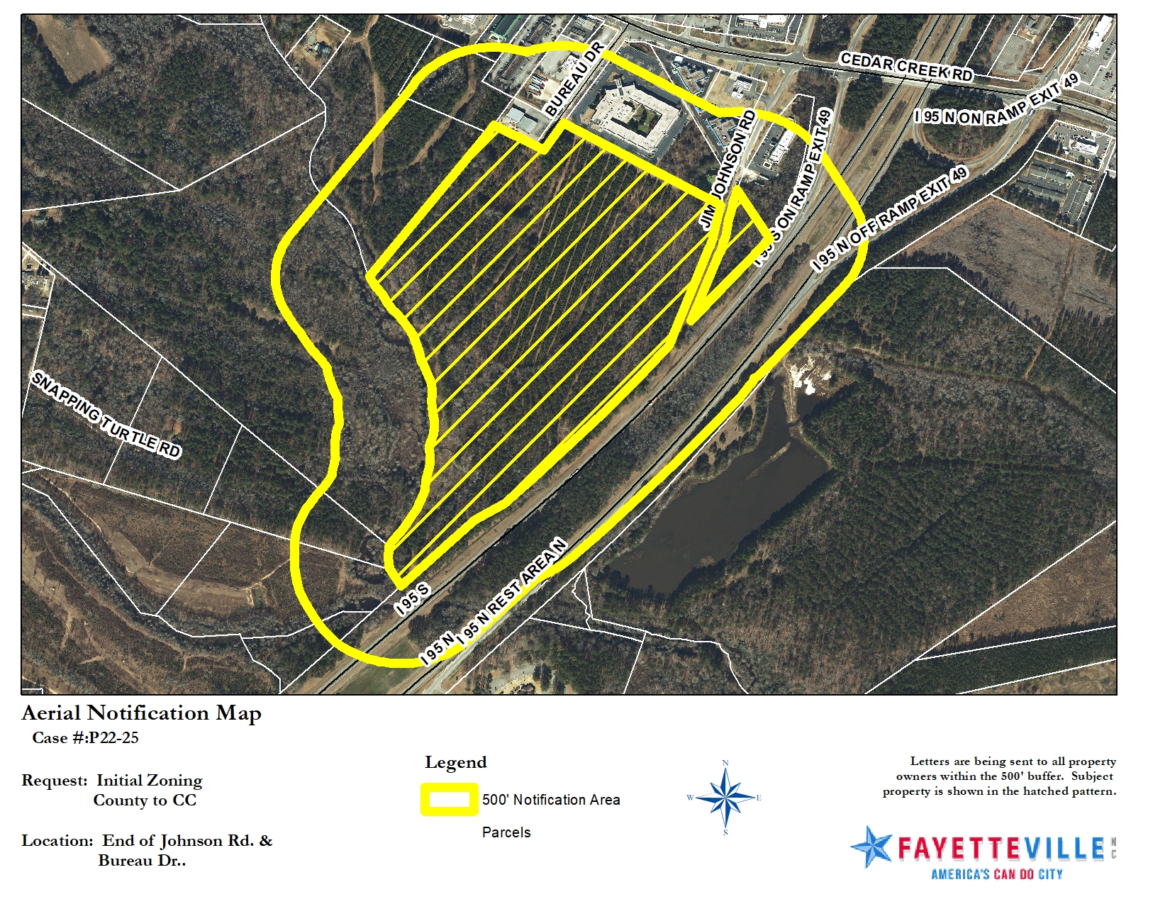 This property is located at the end of Jim Johnson Road and Bureau Drive. This property is located in the City of Fayetteville’s Municipal Influence Area (MIA) and the owner has petitioned for annexation. This is a contiguous annexation and rezoning of property that runs along Interstate 95. Both commercial and rural zoning and uses surround this property.