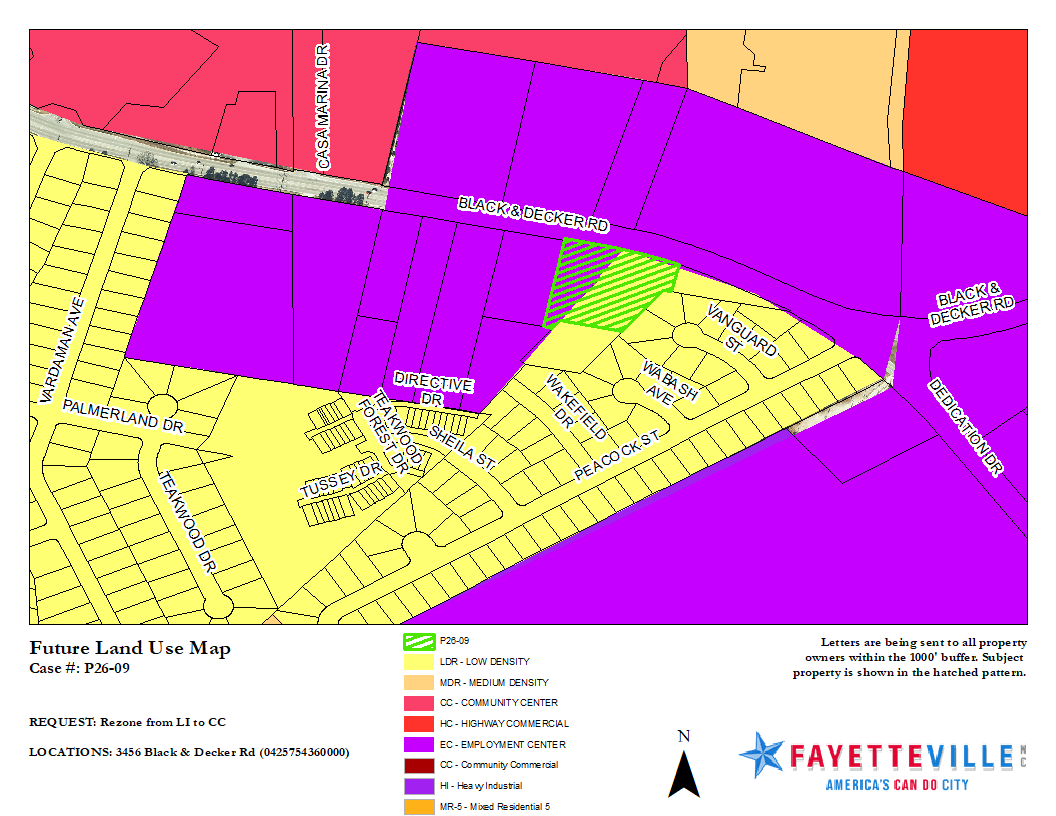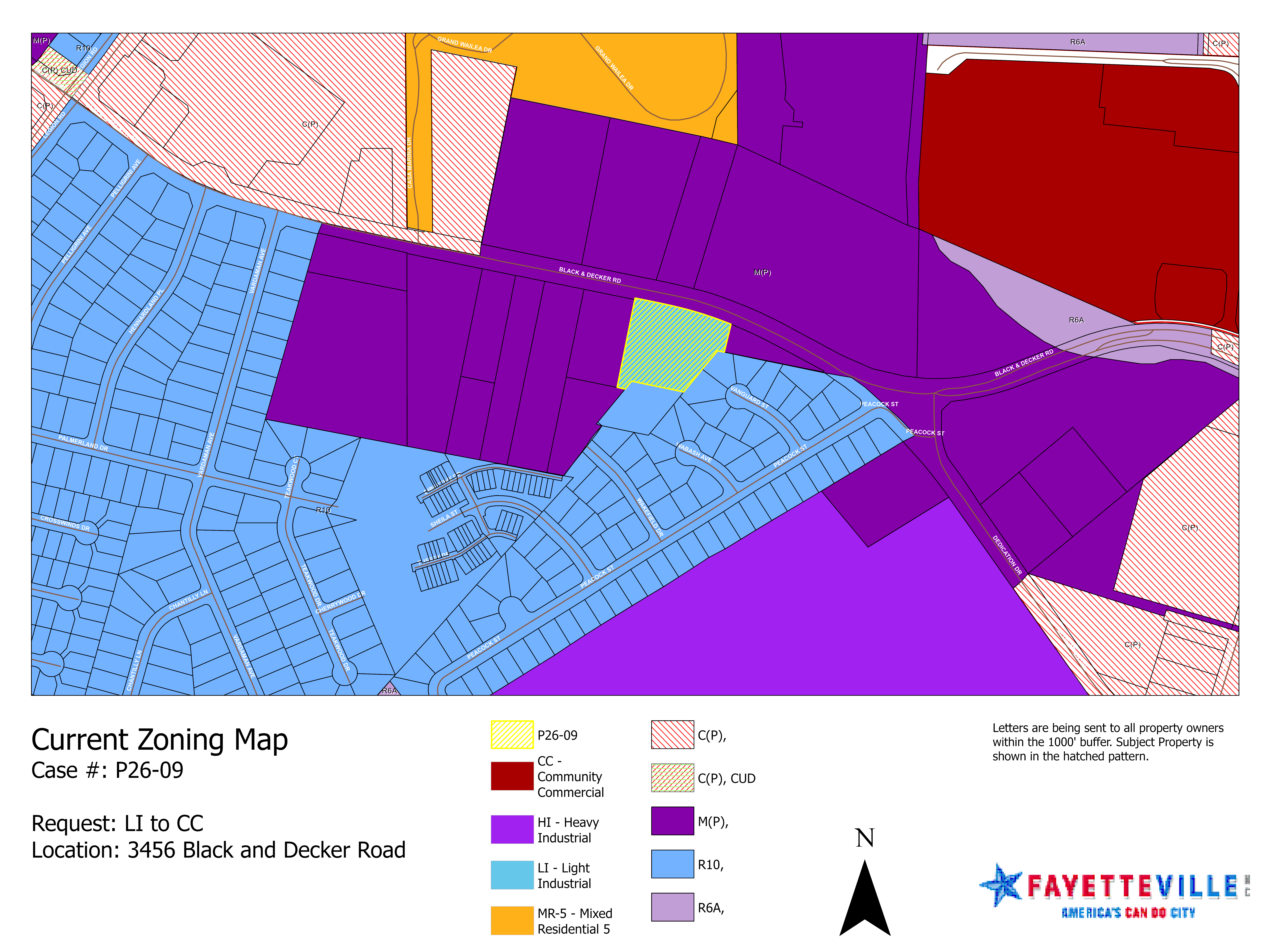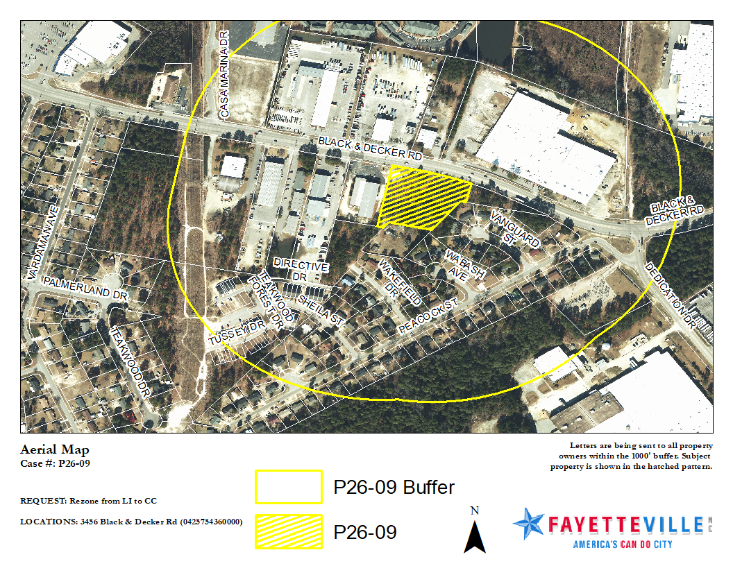 P26-09 is a rezoning request to change the 2.55 acres located at 3456 Black& Decker Rd from Light Industrial (LI) to Community Commercial (CC).
