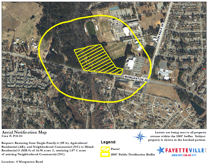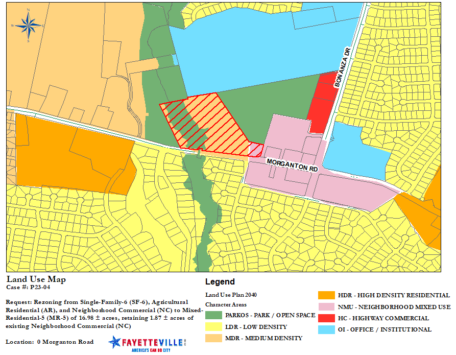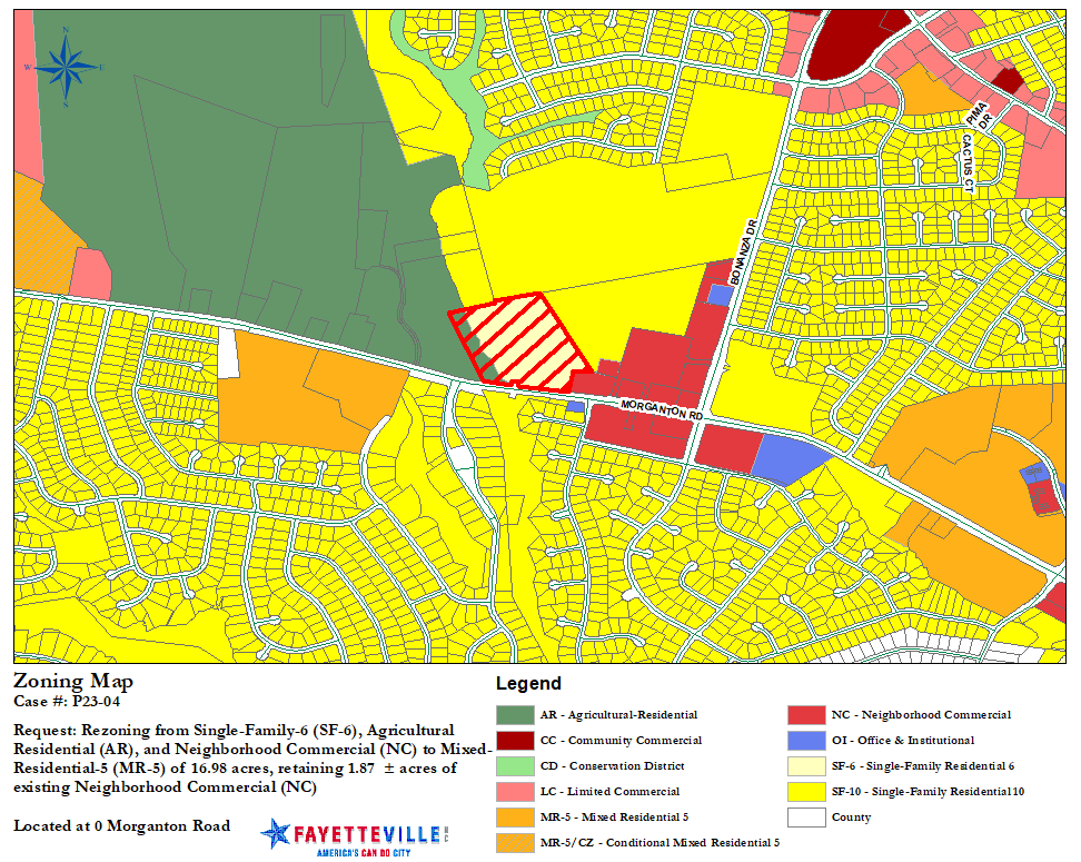 P23-04. Rezoning of 16.98 ? acres of an 18.85? acre parcel zoned Single-Family-6 (SF-6), Agricultural Residential (AR), and Neighborhood Commercial (NC) to Mixed-Residential-5 (MR-5), retaining 1.87? acres of existing Neighborhood Commercial (NC) located at 0 Morganton Road (REID# 0408149306000) and being the property of Alan Smith, et al., represented by Alex Keith of Tom J. Keith & Associates.