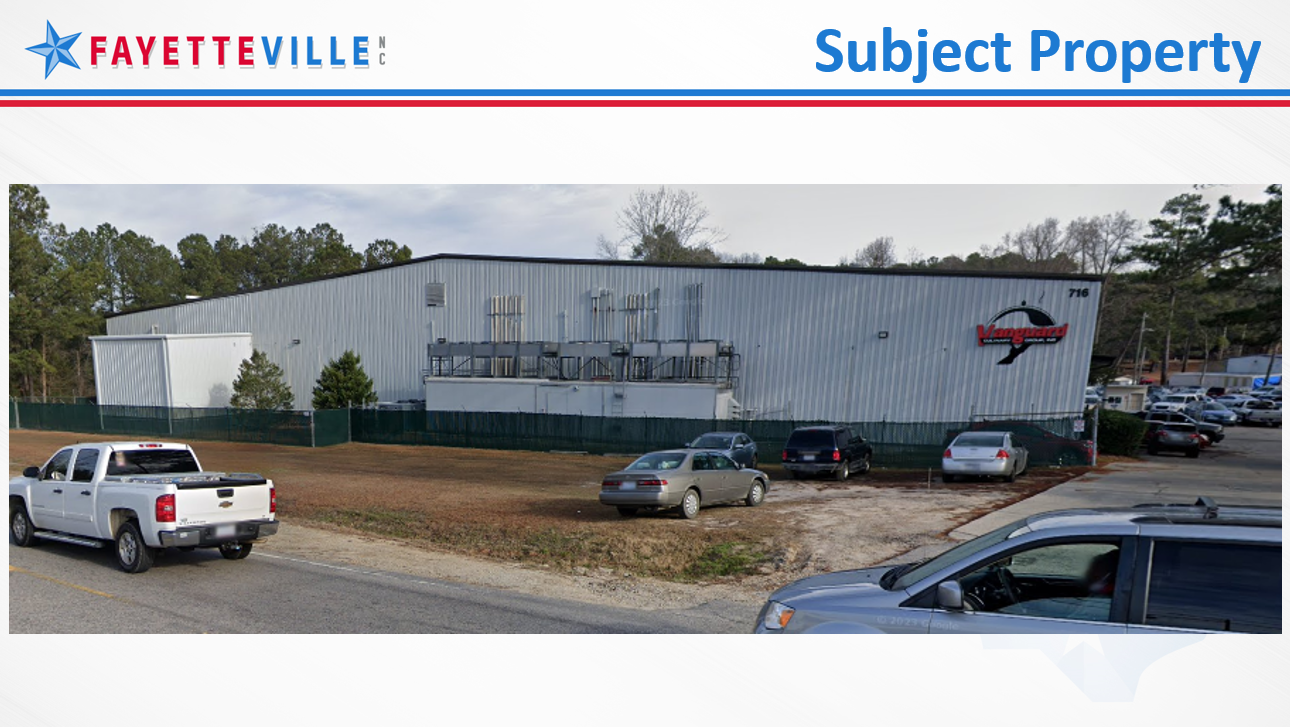 The applicant is seeking to rezone 716 Whitfield Street from Community Commercial (CC) to Light Industrial Conditional Zoning (LI/CZ). Vanguard Culinary Group is located on the subject property and the rezoning is intended to bring the use and the setbacks of the property into compliance.